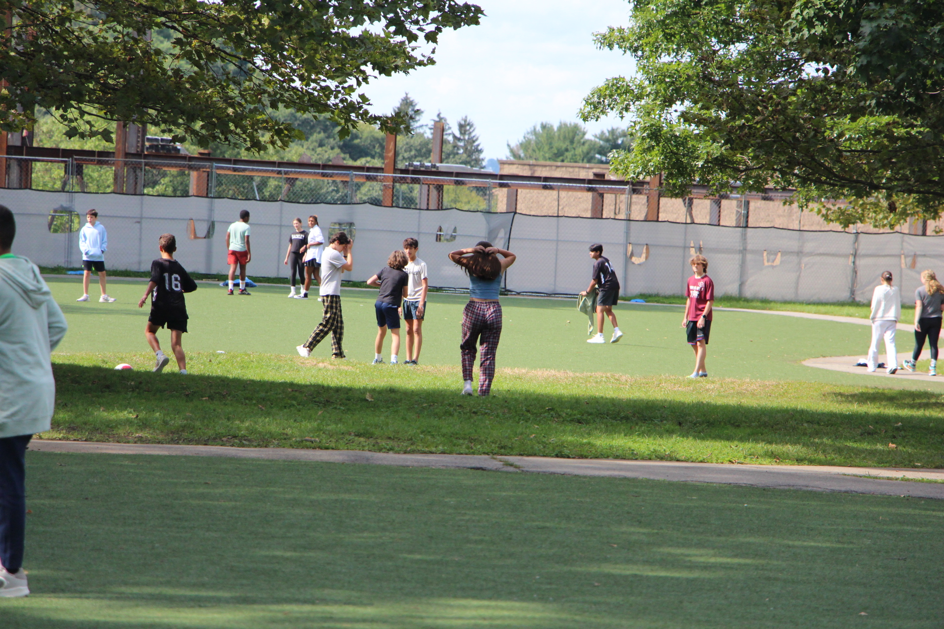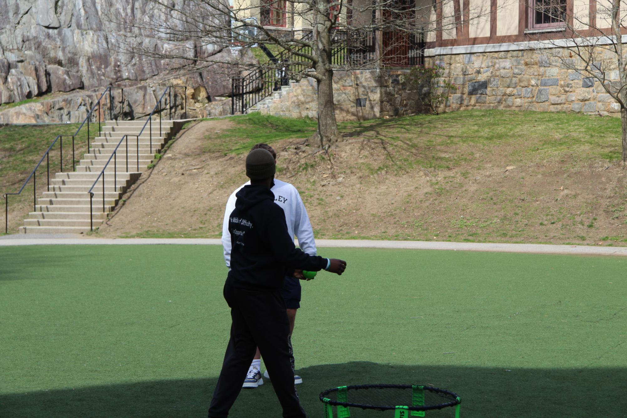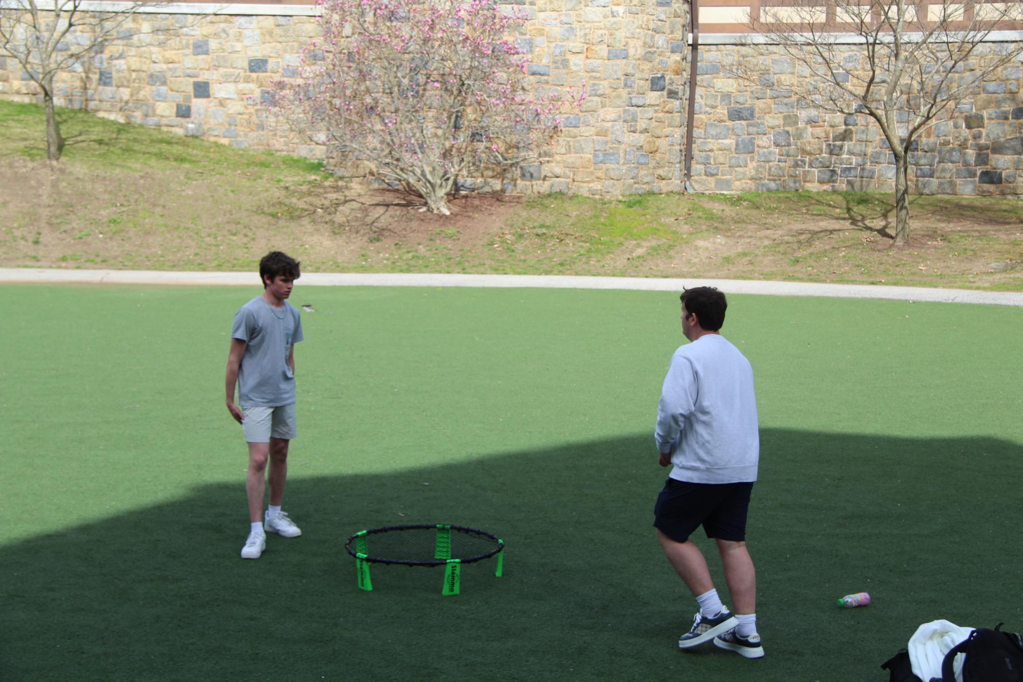Spikeball is very popular among students in warmer weather, with students often playing with one another during common free periods and during lunch periods there are a lot of students enjoying the popular game.
