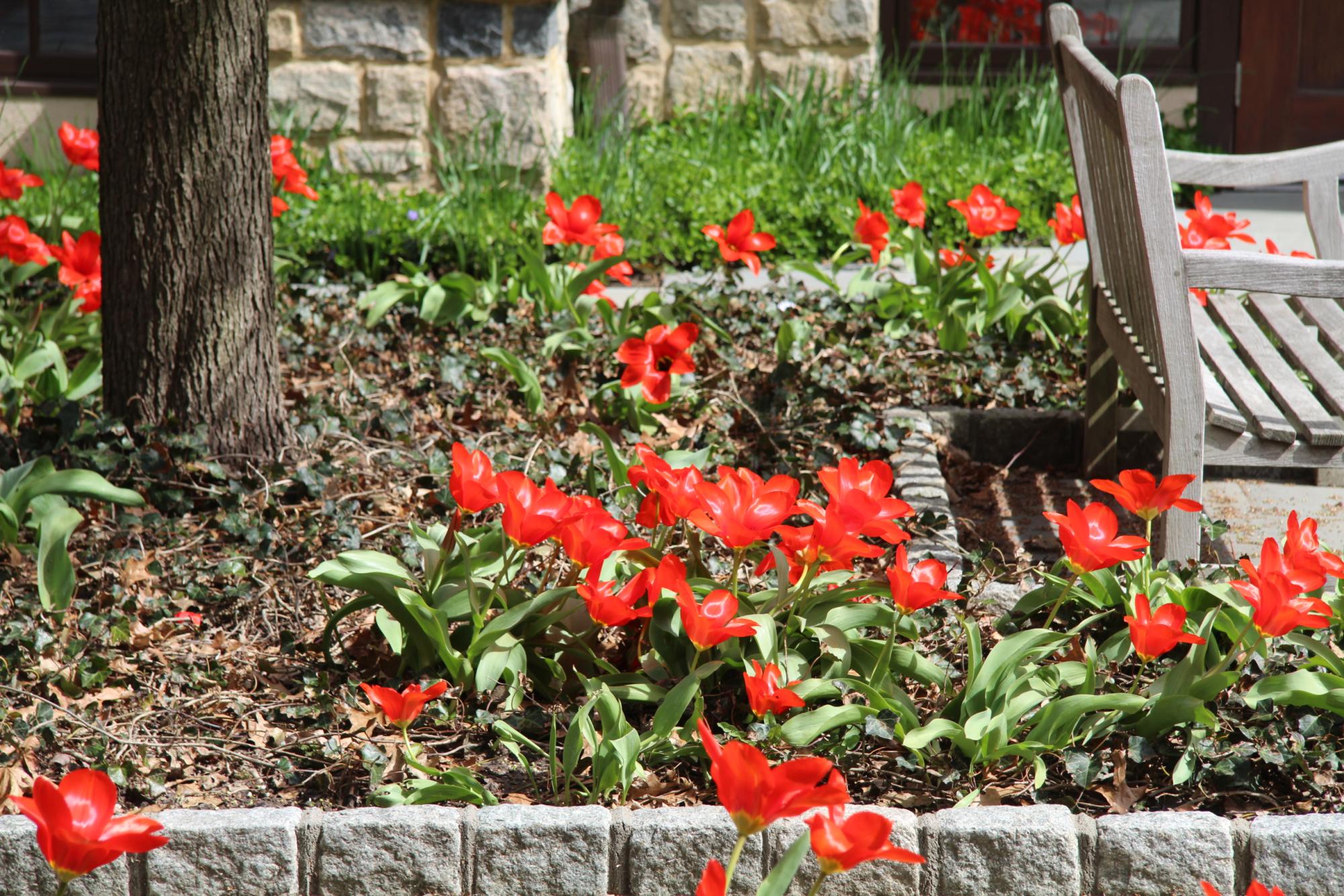 A flight of stairs away from Akin Common is the Johnson Courtyard. This space is often more quiet and peaceful than Akin during the day – with flowers, benches, and seasonally a fountain running providing a more peaceful outdoor area to do work or eat lunch with friends.