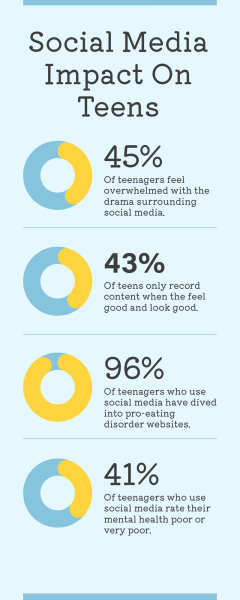 Around 45% of teenagers feel overwhelmed with the drama that surrounds social media, and 43% only make content when they look good and want to look good.This might seem obvious, but while in a scrolling frenzy, you forget all the intent behind the post and just stare directly into the phone which holds your biggest insecurities. These insecurities have caused major issues for teenagers. 96% of teenagers have been diving into websites that support pro-eating disorders and huge weight loss. Some of these sights aren’t even created by educated people, but teenagers become so blinding by comparison that they would do anything to look different. 41% of teens who have social media rate their mental health as poor or very poor. This demonstrates the massive toll social media has taken on teenagers. Teenagers are so caught up in what they could be, that they forget to take care of themselves, and slowly lose confidence and happiness.